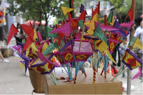 早上十點(diǎn)左右,火把就快扎好了。色彩鮮艷的紙裱斗升上各色卷著的彩旗正一個(gè)個(gè)被打開,梨、蘋果、花紅正被栓成一串串地掛在樹枝上,水泥桌上擺著小旗、炒蠶豆和糖果等,老人們在一旁邊笑邊聊,一盤彩色米干在燦爛的笑著。