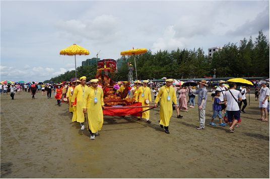 今年適逢中國(guó)共產(chǎn)黨成立100周年,活動(dòng)當(dāng)天,氵萬(wàn)尾村洋溢著濃濃的愛(ài)國(guó)熱情?;顒?dòng)開(kāi)始,身著京族服飾的當(dāng)?shù)卮迕駠墼谄鞐U前,舉行升國(guó)旗奏國(guó)歌儀式。隨后迎神隊(duì)伍在鑼鼓和鞭炮聲中到達(dá)海邊,將“海神”迎回哈亭敬奉,祈求人畜興旺,五谷豐登(見(jiàn)圖)。眾多慕名而來(lái)的區(qū)內(nèi)外游客集聚哈亭和海邊,與京族同胞一起歡慶這盛大的節(jié)日。