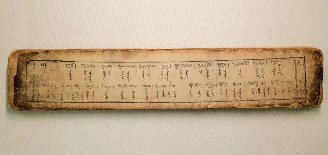 藏蒙對(duì)照詞典《詳解月光辭典》又稱《浩月輝映詞典》,該詞典由阿拉善拉隆巴阿旺丹德?tīng)柧幹宓拦馐四辏?838)北京嵩祝寺木刻本。1卷,139葉,頁(yè)面尺寸10.6×56厘米,版框尺寸7.5×49厘米,四周雙欄,梵來(lái)裝。每頁(yè)以藏蒙、藏蒙四行為階梯排列,每列35行,每行1字。頁(yè)面左側(cè)有藏文頁(yè)碼,右側(cè)有漢字《永》和漢文頁(yè)碼。