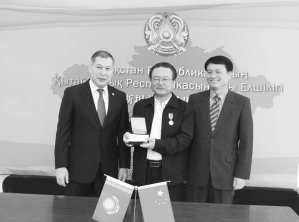10月17日,艾克拜爾(中)被授予哈薩克斯坦外交部建立外交關(guān)系25周年金質(zhì)獎(jiǎng)?wù)拢_克斯坦駐華大使沙赫拉特·努雷舍夫(左)為其頒發(fā)了獎(jiǎng)?wù)隆?/span>