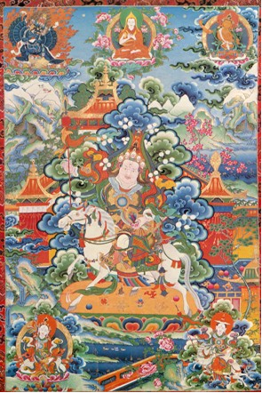 勉塘畫派是15世紀(jì)以后影響最大的繪畫流派,主要流行于衛(wèi)藏地區(qū)及昌都部分地區(qū)。該畫派的創(chuàng)始人是勉拉頓珠,他出生于洛扎勉塘(今山南地區(qū)),勉塘畫派由此而得名。他大約出生于公元十五世紀(jì)20年代或30年代。據(jù)史料記載,勉拉頓珠出生的時(shí)間正好與他家鄉(xiāng)發(fā)現(xiàn)了朱砂礦的時(shí)間一致。這種重要繪畫顏料的出現(xiàn),預(yù)示著一代繪畫大師降臨人世。他自幼聰慧,毫不費(fèi)力地學(xué)完各種字體的書寫、大小五明中的絕大多數(shù)內(nèi)容。成年后,拜后藏一帶的著名美術(shù)大師多巴扎西杰布為師,苦心鉆研,在繪畫藝術(shù)領(lǐng)域取得了很深的造詣。通曉了藏、漢、印、尼泊爾等各種繪畫派別的技法,他根據(jù)《續(xù)部》等編寫了繪畫理論專著《造像量度如意寶》,并創(chuàng)立了勉塘畫派。他參與了一世達(dá)賴?yán)锔刂彀团c1447年創(chuàng)建的扎什倫布寺措欽大殿壁畫繪制工程的全過(guò)程,單獨(dú)完成了北壁的《釋迦牟尼與十六羅漢圖》與《八十大成就者環(huán)圍金剛持》兩幅壁畫,在西壁勉拉頓珠親手繪制了《釋迦牟尼十二宏化圖》的白描部分。另外在該寺以及同時(shí)代建造的諸多廟宇繪制完成了大量的壁畫、巨幅堆秀唐卡及小型唐卡。其中最負(fù)盛名的是扎什倫布寺的巨幅堆秀唐卡《釋迦牟尼》,其大小約為長(zhǎng)32.9米、 寬19.3米。該畫派造像法度精嚴(yán),與傳統(tǒng)的表現(xiàn)手法相比,尤其注重線條的運(yùn)用,線條工整流暢,色調(diào)活潑鮮亮,變化豐富,人物體態(tài)、骨相和肌膚都異常完美,脖頸較長(zhǎng),高度和諧的色彩和色調(diào)的配制十分突出。畫面暈染充分,用色細(xì)膩、柔和、富麗堂皇。由于石青和石綠色突出,從遠(yuǎn)處看,繪畫作品十分優(yōu)美和靜。衣袍和飾帶呈不對(duì)稱形式,棋格使構(gòu)圖消失,諸神位于云端風(fēng)景之中,布局活躍多變,背光中卷草圖案等變成了波浪式放射的金線,該派擅長(zhǎng)表現(xiàn)和靜類神像。