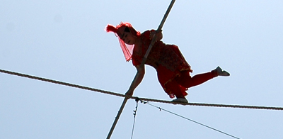 “達瓦孜”既是少數民族傳統體育運動表演項目,也是節(jié)日里娛樂活動,它有雜技和體育的雙重特點?!斑_瓦孜”高空走繩表演十分壯觀,在空曠的場地上,中間聳立三十多米高的立桿,頂處扎一牌樓上掛彩旗。牌樓橫桿兩端有表演用的吊杠和吊環(huán)。表演技能的繩索長八十多米。表演者手持長約6米的平衡桿,不系保險帶,在繩索上作前后走動、盤腿端坐、蒙眼行走,甚至腳踩碟子、飛身跳躍等一系列驚心動魄的動作。經過不斷實踐和發(fā)展,“達瓦孜”表演技巧有了新突破,在濃郁民族風味維吾爾族民間樂曲伴奏中,表演者輕松自如地在、高空繩索上踏著節(jié)拍跳舞歌唱,并且敏捷地變換著高難動作。