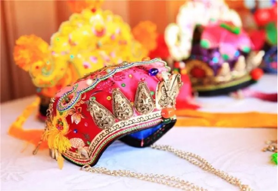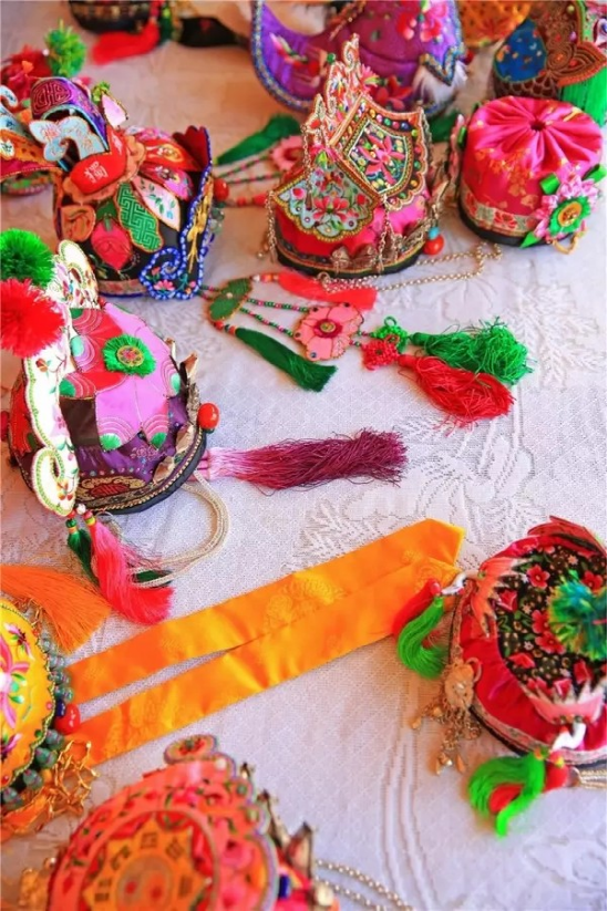 走進(jìn)楊文煥的工作室,猶如進(jìn)入一個(gè)明媚鮮艷的夢(mèng)境。首先映入眼簾的,便是那一頂頂色彩鮮艷、繡工精致的童帽:造型大方、線條流暢的獅子帽;色彩明艷、虎虎生威的老虎帽;精巧別致、活潑可愛的翹尾帽;高雅富麗、古韻悠長的公子帽;別具一格、特色鮮明的牌坊帽。