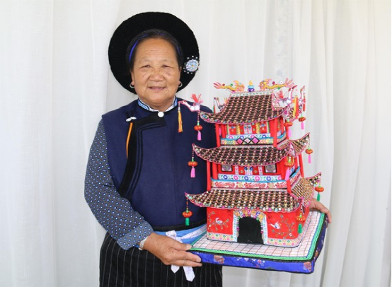 近年來(lái),鶴慶縣高度重視民間文化遺產(chǎn)保護(hù)工作,甸南族刺繡作為民間特色文化遺產(chǎn)之一,得到較好的保護(hù)和傳承。近日,金墩鄉(xiāng)銀河村上曲江自然村71歲的老繡娘趙煥珍,經(jīng)過(guò)多次實(shí)地觀(guān)摩,邊做邊改,邊構(gòu)思邊計(jì)算,以繡花、梳花、牽花、飄花、釘花等多種刺繡方法,歷時(shí)10個(gè)多月,把縣城的地標(biāo)性建筑——云鶴樓按比例縮放,創(chuàng)作出了新的刺繡作品“云鶴樓”。