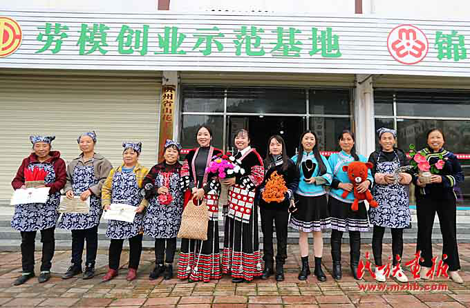 扶貧車間的姐妹們展示作品。