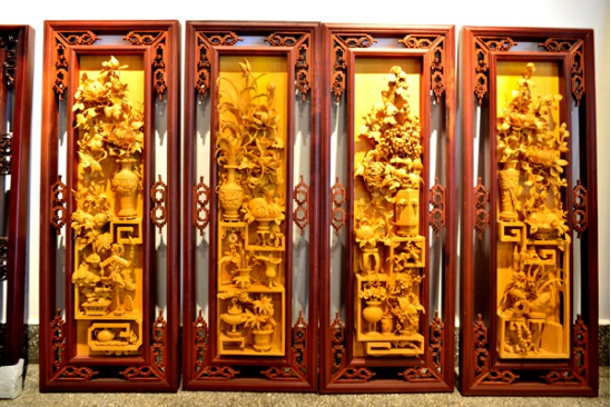 《四條屏掛件》脫胎于“格子門”的上裙板,是由實(shí)用到觀賞的一種很好的轉(zhuǎn)換,是目前最走俏的新產(chǎn)品,無論是賓館客廳或居家,古樸典雅的木雕“四條屏”會增添不少東方文化的雅趣,越來越受到人們的喜愛,許多人都把它作為木雕藝術(shù)珍品收藏。為了給世人留下藝術(shù)精品,許多工藝師潛心研究設(shè)計(jì)、精心雕刻,用半年、甚至一年多的時(shí)間才完成一件“四條屏”。這些精心之作,疏密有致、變化統(tǒng)一,構(gòu)圖飽滿,穿插纏繞,重重疊疊的層層透雕,無不凝聚著制作者的智慧與心血。《四條屏》的圖案設(shè)計(jì),主要有三種內(nèi)容:(1)博古;(2)花卉;(3)花鳥。人物、山水類型的極少。圖案喻意與格子門相近。