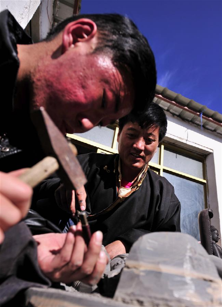 土登加措(右)和他的徒弟在雕刻黑玉石佛像(1月8日攝)。