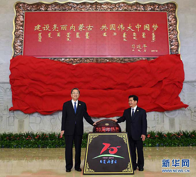70年來,在黨中央高度重視、關(guān)心關(guān)懷下,內(nèi)蒙古各族人民在革命、建設(shè)和改革的各個歷史時期,創(chuàng)造了一個又一個人間奇跡,萬里草原發(fā)生了翻天覆地的歷史巨變。圖為8月7日,中共中央政治局常委、全國政協(xié)主席、中央代表團團長俞正聲率中央代表團出席向內(nèi)蒙古自治區(qū)贈送紀念品儀式,俞正聲和內(nèi)蒙古自治區(qū)黨委書記、人大常委會主任李紀恒一同為習(xí)近平總書記題詞賀匾揭幕(新華網(wǎng))