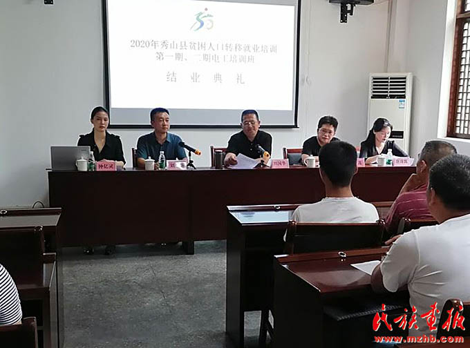 2020年6月29日,鐘億靈(左一)出席在清溪場鎮(zhèn)武陵山致富帶頭人實(shí)訓(xùn)基地舉行的秀山縣2020年貧困人口轉(zhuǎn)移就業(yè)培訓(xùn)第一、二期電工培訓(xùn)班結(jié)業(yè)典禮。(秀山縣人民政府網(wǎng))