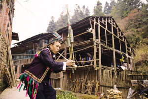 在侗族人口占78%的湖南省通道縣的牙屯堡鎮(zhèn),我們原本準備尋找會織侗錦的姑娘,卻在風雨橋上被一陣聲響吸引住了,便問當?shù)厝耍骸斑@是何聲?制樂者何人?”原來,此聲為蘆笙所發(fā),制蘆笙者為楊枝光。他制作的侗族蘆笙,因手藝出眾,在湘黔桂的侗族村寨頗有名氣。2008年6月,侗族蘆笙被列入國家級非物質文化遺產(chǎn)名錄,楊枝光榮幸地成為侗族蘆笙制作唯一的國家級“非遺”傳承人。