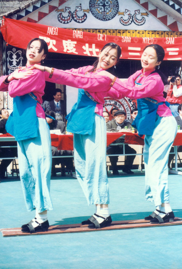 壯族傳統(tǒng)的娛樂性舞蹈主要是在節(jié)日或喜慶期間舉行。類型主要為模擬勞動(dòng)舞和擬獸類舞兩種。模擬勞動(dòng)舞表現(xiàn)壯族人民的生產(chǎn)勞動(dòng)的樂趣。如紅水河流域的壯族在春節(jié)舉行的孝蛙婆活動(dòng)中所跳的撈蝦舞、捕魚舞、狩獵舞、撒秧舞、插田舞、收割舞。壯族各地流行的扁擔(dān)舞、采茶舞、繡球舞、舂堂舞、板鞋舞等。這類舞蹈的動(dòng)作舒緩柔和、抒情柔美、表現(xiàn)了農(nóng)業(yè)民族的細(xì)膩性格。擬獸類舞是模仿獸類肢體語(yǔ)言的一種舞蹈,此類舞蹈在壯族地區(qū)也頗為流行。最常見的是蛙舞、舞獅、舞龍、和舞春牛?;ㄉ缴系耐苄挝枳穗p手彎肘向上,兩腿半蹲成騎馬式,動(dòng)勢(shì)很大。此外,壯族各地還有螞拐舞、彩蝶舞、魚蚌舞、馬鹿舞、金雞舞等。動(dòng)作總體來說舒緩柔和、抒情柔美。但表現(xiàn)勞動(dòng)的舞蹈緊張熱烈,表現(xiàn)抗?fàn)幍奈璧复挚裼辛?,模擬動(dòng)物的詼諧逗趣,呈現(xiàn)出多姿多彩的形態(tài)。