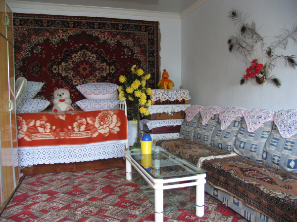 木刻楞房的室內(nèi)結(jié)構(gòu)一般有客廳、臥室、廚房和儲(chǔ)藏室四部分構(gòu)成,房屋的整體結(jié)構(gòu)呈四方形,建造有傾斜度較高的屋頂,利于雨雪不會(huì)覆蓋在屋頂,從而造成屋頂承重過高而發(fā)生坍塌。此外,俄羅斯族人一般都會(huì)選用紅色、藍(lán)色或者綠色的鐵皮將屋頂精心包裹一番。這不僅可以起到很好的防風(fēng)御寒、防止雨雪滴漏進(jìn)室內(nèi)的效果,而且也使木刻楞房色彩十分和諧艷麗。房屋的正門之前一般會(huì)建造寬闊的門庭和圍廊,門內(nèi)有過道,過道兩旁是臥室和客廳。室內(nèi)的墻角有土坯壘砌的火墻。有的人家是大型壁爐,外包一層鐵皮,鐵皮上抹一層黑油,俗稱“毛爐”,是很好的取暖設(shè)備。室內(nèi)陳設(shè)比較講究,臥室擺放著木床或鐵床,鐵床欄桿雕有花草圖像,給人以古雅之感。木刻楞房室內(nèi)一般會(huì)在地面鋪上木地板,俄羅斯族人們也十分喜愛在家中鋪設(shè)飾有各類花紋圖案的地毯。