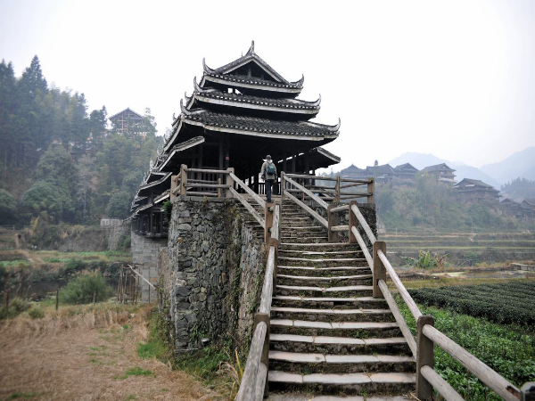 風(fēng)雨橋以石拱木作,廊、屋、亭、閣為一體,造型別致、美不勝收。無論是遠(yuǎn)眺還是進(jìn)觀,都體現(xiàn)出獨(dú)特的審美意境。鏈接廊橋與屋亭的是長(zhǎng)條青石,橋與村寨的連接則用花石鋪路,橋面主體是當(dāng)?shù)厮寄静?。這種自然生態(tài)環(huán)保的理念,更彰顯了瑤族人民獨(dú)特的審美境界。