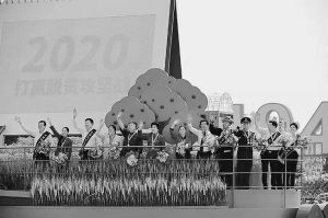 2019年10月1日,慶祝中華人民共和國(guó)成立70周年大會(huì)在北京天安門廣場(chǎng)隆重舉行。圖為群眾游行中的“脫貧攻堅(jiān)”方陣彩車。 新華社記者 李尕?cái)z