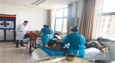 西藏自治區(qū)藏醫(yī)院藏醫(yī)藥浴中心負(fù)責(zé)人次仁桑珠,在為患者做藏醫(yī)藥浴治療。