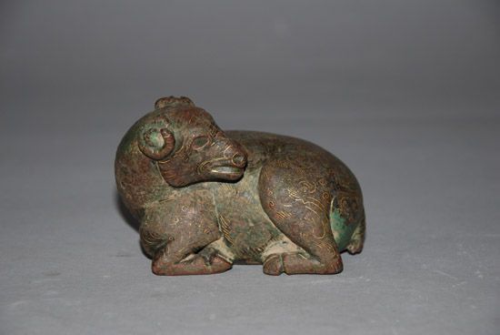 銅羊做蹲臥式,盤角,回首,兩眼凝視,似乎聞聲將起,體型肥碩,神態(tài)溫馴、生動活潑,栩栩如生。在鑄造上工匠利用傳統(tǒng)的錯金銀工藝,用金絲銀線鑲嵌全身,凸顯出羊首輪廓和纖細卷曲的絨毛,金光銀彩交相輝映,更顯得生氣盎然。兩漢時期不但繼承了先秦時代已有的錯金銀技術,而且還有一定的創(chuàng)新,工藝更為精湛。