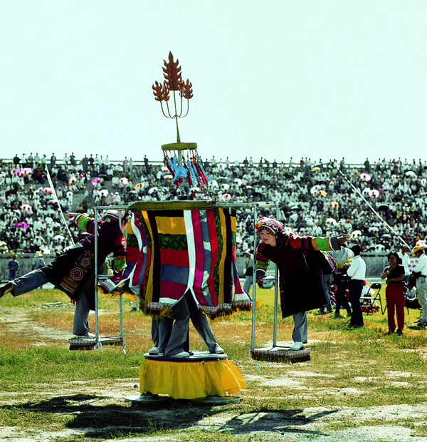 輪子秋,土語(yǔ)稱(chēng)“卜日熱”,是土族人在農(nóng)閑時(shí)舉行的一種體育活動(dòng),主要在青海互助土族一帶流行。每年冬季碾完場(chǎng)后,特別是春節(jié)期間,人們?cè)谄秸麑挸ǖ柠湀?chǎng)或其他可以利用的場(chǎng)地上,把馬拉大車(chē)的車(chē)棚卸下來(lái),將輪和軸整體豎起,然后將抵在地上的輪上壓上石頭等重物,固定重心。隨后,在上面的輪子上橫著綁一架三四米長(zhǎng)的梯子,兩端各綁一個(gè)U形的秋千坐套。人坐在坐套內(nèi),由他人推動(dòng)轉(zhuǎn)圈。現(xiàn)在許多土族村莊,每年還要舉行輪子秋比賽。比賽時(shí),兩人各坐于座套上,然后推動(dòng)木梯,使之快速轉(zhuǎn)動(dòng)。參賽者可表演“雄鷹展翅”“金雞獨(dú)立”“孔雀開(kāi)屏”“猛虎下山”“金鐘倒掛”“蛟龍出?!钡润@險(xiǎn)的高難度空中動(dòng)作。比賽常以轉(zhuǎn)時(shí)長(zhǎng)、頭不暈、眼不花、站立較穩(wěn)當(dāng)?shù)霓D(zhuǎn)秋者為優(yōu)勝者。近年來(lái),輪子秋已被列為全國(guó)農(nóng)民運(yùn)動(dòng)會(huì)和民族運(yùn)動(dòng)會(huì)的表演或比賽項(xiàng)目。輪子秋也得到改進(jìn),現(xiàn)多用鋼管為原料焊接,還裝上了滾珠軸承,使用更加安全。