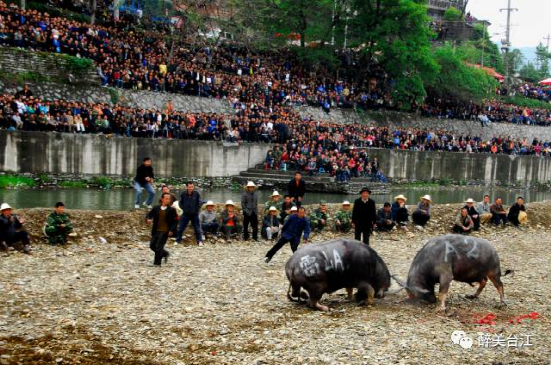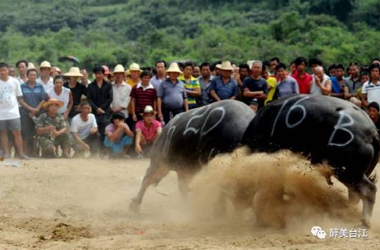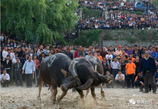 ▲ 斗牛之牛,都是專門(mén)精心飼養(yǎng)的,不從事耕地、拉車、推磨等勞作,均為雄性水牛,分為寬角、窄角兩個(gè)級(jí)別。斗牛賽制,先為淘汰賽,決斗時(shí)改為單循環(huán)賽,最后勝出者為年度牛王。斗牛場(chǎng)面十分慘烈,動(dòng)人心魄,觀眾少則數(shù)百,多則數(shù)萬(wàn)。