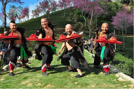 南澗“彝族跳菜”主要有“宴席跳菜”和“舞臺跳菜”兩大類?!把缦恕币卜Q“席間跳菜”或“實地跳菜”,是當(dāng)?shù)匾妥迦罕娫诮Y(jié)婚慶典、新房落成、迎接貴賓、給老人祝壽等重大喜慶場合,宴請賓客,為增加喜慶氣氛而跳菜,講究“吃著并快樂著”。另一類是“舞臺跳菜”,根據(jù)表演地點或舞臺大小又分為“舞臺跳菜”和“廣場跳菜”。“舞臺跳菜”即舞臺上表演的跳菜,演員通常在20人左右,舞蹈動作粗獷豪放、剛健有力,聲音高亢明亮。而“廣場跳菜”演員少則幾十人,多則可達(dá)幾百人,氣勢恢宏、整齊和諧。