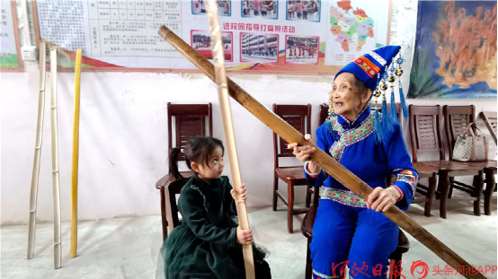 今年已經(jīng)88歲高齡的“壯族打扁擔(dān)”技藝傳承人唐小琴,她從小即耳濡目染,跟村里老人、長(zhǎng)者學(xué)習(xí)打扁擔(dān),后因打扁擔(dān)需要指揮,又學(xué)習(xí)皮鼓打法。1961年4月,唐小琴?gòu)膶W(xué)校調(diào)入縣文化館任文化藝術(shù)輔導(dǎo)員,挖掘整理了《壯族打扁擔(dān)》《板凳舞》《斑鳩舞》等一大批傳統(tǒng)舞蹈,并多次在自治區(qū)、河池地區(qū)的比賽、調(diào)演上獲獎(jiǎng)。1986年退休后,仍然致力于《壯族打扁擔(dān)》的傳承工作,2004年,組建都安縣老干康樂(lè)藝術(shù)團(tuán),帶動(dòng)安陽(yáng)鎮(zhèn)退休老人學(xué)習(xí)打扁擔(dān)技藝。2009年,她被確認(rèn)為自治區(qū)非物質(zhì)文物遺產(chǎn)項(xiàng)目“壯族打扁擔(dān)”代表性傳承人。