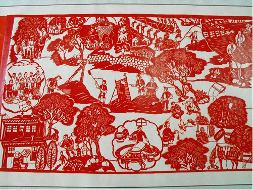 2、達(dá)拉特紀(jì)事剪紙的歷史價(jià)值很高,《農(nóng)民紀(jì)事圖》上卷記載了從建國(guó)到現(xiàn)在農(nóng)村的發(fā)展變化,在作品中我們看到了很多瀕臨失傳的農(nóng)村生產(chǎn)生活工具和生產(chǎn)方法,也能看到黨和國(guó)家在每一年出臺(tái)的各項(xiàng)惠農(nóng)利民政策,對(duì)于研究歷史具有重大的文獻(xiàn)價(jià)值。