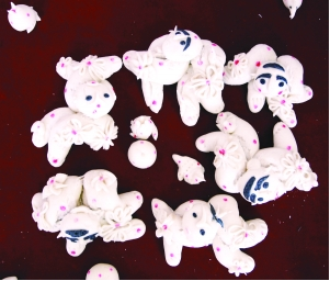 制面塑的工具比較簡單:有剪刀、菜刀、梳子、紅棗、花椒、紅豆等物。只要掌握好發(fā)面技術(shù),按照式樣進(jìn)行捏制,那么一個(gè)鮮活的面模形象就會脫穎而出。面塑的藝術(shù)的特點(diǎn)是“一印、二捏、三鑲、四滾”另外還有“文的胸、武的肚、老人的背脊、美女的腰”。