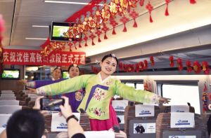 沈佳高鐵長白山至敦化段開通運營,將促進沿線旅游業(yè)和冰雪經(jīng)濟快速發(fā)展,進一步加強民族團結,助力長吉圖開發(fā)開放、深度融入 “一帶一路”。圖為列車工作人員在車內表演朝鮮族歌舞。 新華社發(fā)