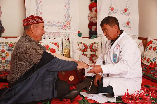 居馬泰·俄白克多年的恩師阿吾爾達(dá)·合德爾現(xiàn)在也是他的病人,這位80多歲的老人向記者說道居馬泰·俄白克翻雪山、過冰河,無數(shù)次遇險(xiǎn),但他仍在堅(jiān)持。把我們這些患者當(dāng)作家人對待。學(xué)生時(shí)代的居馬泰·俄白克就是思想積極,熱心善良的好孩子。工作后獲得榮譽(yù)受到習(xí)總書記的接見,回到工作崗位上,很多牧民騎馬趕來看望他,他就利用這個(gè)機(jī)會(huì)向牧民宣傳黨的惠民政策、民族團(tuán)結(jié)和健康保健等知識(shí)。”