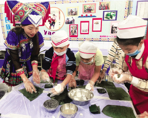 廣西南寧市南師附小把民族團結(jié)教育融入日常教學中。圖為老師和同學們一起制作傳統(tǒng)美食。叢蓉攝