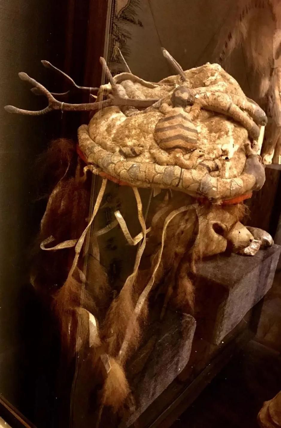 展區(qū)內(nèi)還陳列著幾套保存完整的薩滿服飾,有鹿皮、獸皮、魚(yú)皮和纖維等多種材料。與國(guó)內(nèi)留存的薩滿服飾不同的是其鹿角帽的制作,鹿角帽上裝飾著龜、蛇和神偶形象,頂端八岔鹿角的材料是金屬。