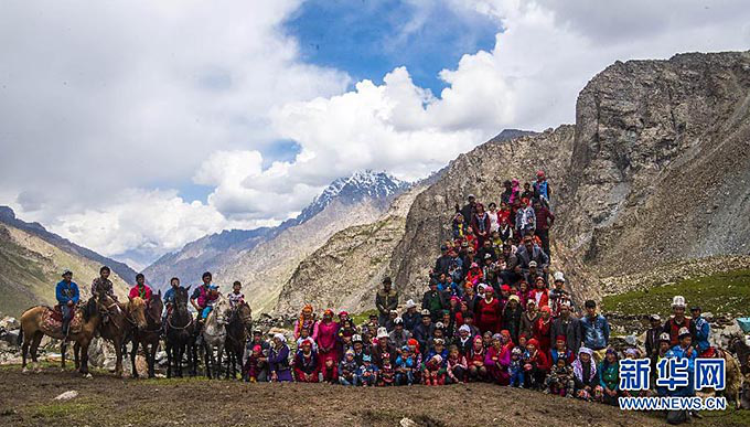 帕米爾高原慕士塔格峰腳下的新疆克孜勒陶鄉(xiāng)喀拉塔什其木干村的村民在夏牧場合影