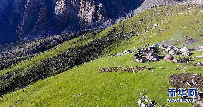 在“鐵日孜窩孜”夏牧場,喀拉塔什其木干村的村民們清晨將羊群趕到牧場上吃草