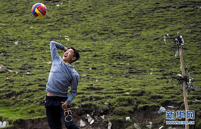 開學(xué)就該上高三的喀拉塔什其木干村村民圖潤塔依·艾沙買買提用木棍和簡易的網(wǎng)子在家門口的空地上劃了一塊排球場