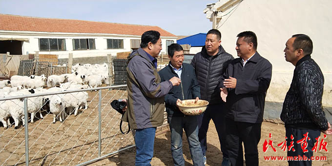 寶力根蘇木黨委書記青格勒(右2)和牧民研究新型羊飼料