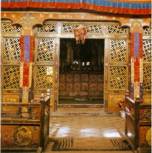 大門由于它的位置所在不應(yīng)該列入室內(nèi)裝飾,但它與室內(nèi)裝飾息息相關(guān),連成一體,故我們把它當(dāng)作室內(nèi)裝飾在這兒加以介紹。門框裝飾包含門框本身、門楣、門楣上的屋檐、門板等。藏族建筑大門裝飾十分講究,從屋檐到門坎都用雕、繪的手段充分加以裝飾。屋檐用兩道方本間隔排列,上蓋青石片和黃土筑成底小頭大的形狀,它不僅有美觀的裝飾效果,而且起到防水作用。屋檐下是門楣,門楣上彩繪各種圖案,門框的木構(gòu)件上雕刻蓮花花瓣和累卷疊函凹凸方格圖案,這種圖案處理形式大部分民居大門大同小異。門板為單開式,板門為了加固起見上、下分層釘鐵條。門板一般涂單一色,不作繪畫處理。除了這些裝飾以外,門相上掛短縐簾,門框左右邊緣墻上涂兩道黑色豎條,每年過年前短縐簾要棄舊換新,黑色豎條與粉刷外墻一道重新涂漆,這是一般民居門框裝飾。寺廟門框裝飾較為復(fù)雜,門楣的間隔方木上加一層雕刻動物頭像的木雕作品排成一行,裝飾門楣這一板塊,門框木構(gòu)件多則六、七層,層層雕刻各種圖案,可見其講究程度。寺廟門板大多是對開式,用鐵條包裝門邊緣,中間分層釘鐵條,涂一層單一的顏色,特殊殿堂如擴(kuò)法神殿大門門板上要進(jìn)行繪畫處理,寺廟大門講究厚重、莊嚴(yán)。無論是民居大門還是寺廟大門,其裝飾要求與室內(nèi)梁柱裝飾相協(xié)調(diào),從顏色的運用到雕刻內(nèi)容都要做到這一點,保持內(nèi)外裝飾效果統(tǒng)一。