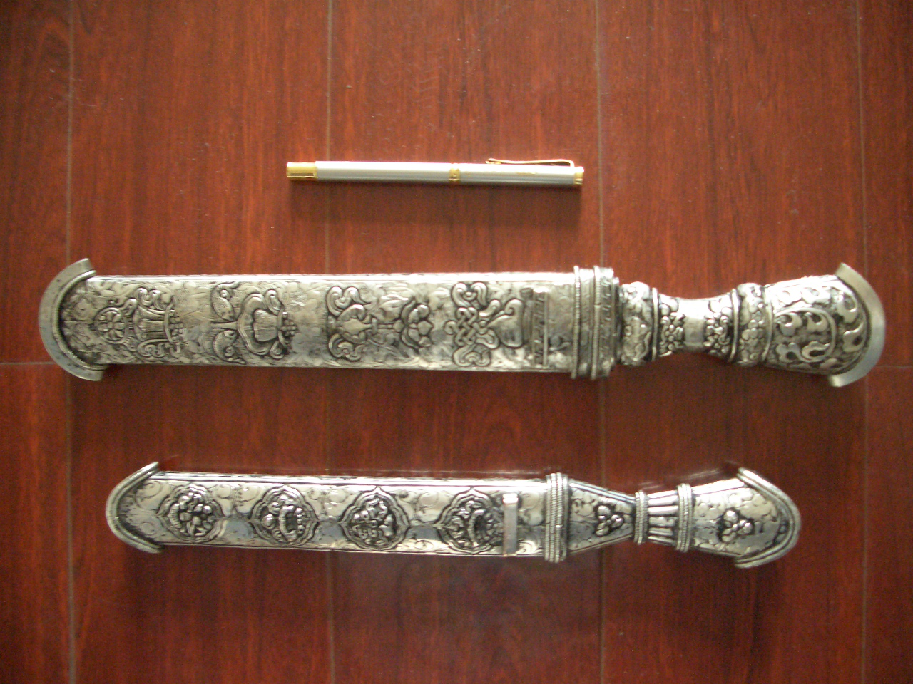 藏刀具有生產(chǎn)、生活、自衛(wèi)、裝飾4種用途,已有1600多年的生產(chǎn)歷史,做工講究,刀身用鋼材鍛,刀柄用牛角或硬質(zhì)木料加工而成。從規(guī)格尺寸上分,藏刀大致為長(zhǎng)刀、短刀和小刀三種。長(zhǎng)刀最長(zhǎng)的有一米多,短刀約40厘米左右,小刀則僅有十幾厘米長(zhǎng)。從形狀上講,具有很強(qiáng)的地方特色,有牧區(qū)式、康巴式、后藏式等區(qū)別;用途也有很多種,如林區(qū)砍樹(shù)有專門的砍樹(shù)刀,屠夫用的屠宰刀等。 藏刀把多用以牛角、牛骨或木材制成,較高檔的刀把用銀絲、銅絲等纏繞,刀鞘則更為講究,較簡(jiǎn)單的有木鞘或皮套外,多數(shù)是包黃銅、白銅,甚至包白銀、鍍金等,上面刻有精美的飛禽走獸及花草等各種圖案,有的還鑲嵌各種寶石、彩石,顯得華麗和富有。拉孜生產(chǎn)的藏力,歷史悠久,樣式美觀,淬火適中,刀刃鋒銳,再配上精致、貴重的刀鞘,雕著龍、鳳、虎、獅和錦花圖案,精美的藏刀大都出自能工巧匠之手。由于鍛打精致,鐫刻細(xì)膩,色彩奪目,并附有藏文,系有五顏六色柄穗,形成別具一格的藏族工藝品。藏刀的主要加工材料有銀、銅(白銅、黃銅、紫銅)、鐵、鯊魚(yú)、牛角、瑪瑙、硬雜木等。過(guò)程有冶煉熔化、模具翻鑄、敲摳大形、刻花鑲嵌、焊接組合、加固、銼磨整形、精雕細(xì)刻及鎂洗拋光等工序。