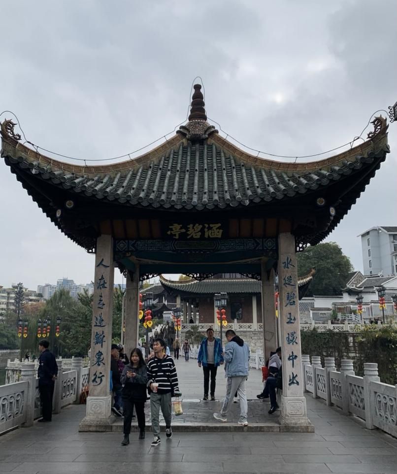 第一部分是石牌坊、浮玉橋和涵碧亭。漢白玉石牌坊上書“城南勝跡”四個大字,立柱的“抱鼓石”為八尊石獅子,石獅尾朝上頭朝下,活靈活現(xiàn),富有生氣。穿過石牌坊走上浮玉橋,橋體連接南北兩岸,其名來源于其質(zhì)地,由貴州特產(chǎn)白棉石打造,從遠處看猶如一條玉帶浮在水面。橋上的涵碧亭是古人納涼休息的地方,因橋下有深潭“涵碧潭”而得名,亭子四柱上刻有兩幅對聯(lián),分別是“水從碧玉環(huán)中出,人在青蓮瓣里行”、“銀漢浮空星過水,玉虹拖雨雁橫秋”。